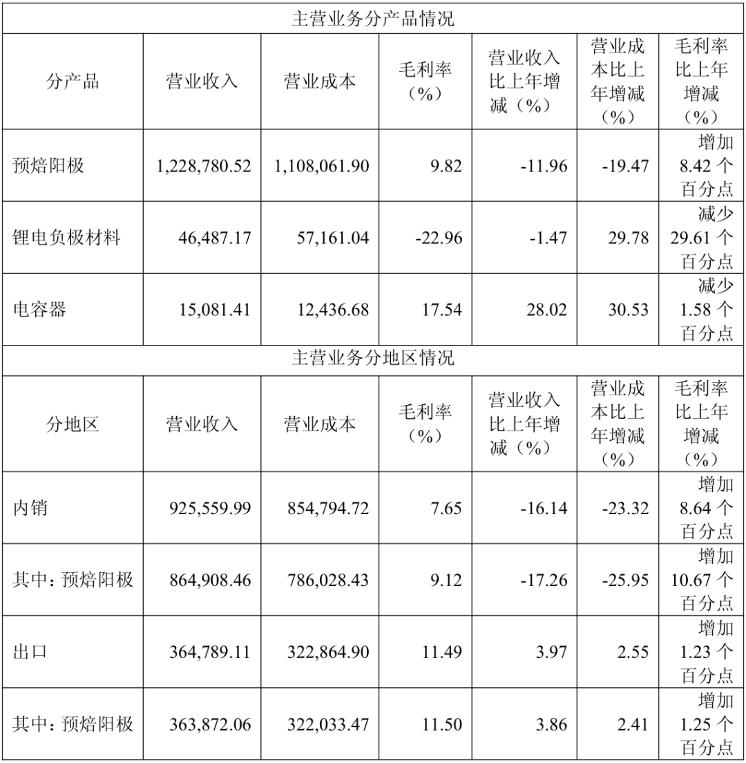 其主营业务是预焙阳极、锂电池负极材料、薄膜电容器的研发、生产及销售。看一下2024年年报各项产品的占比: